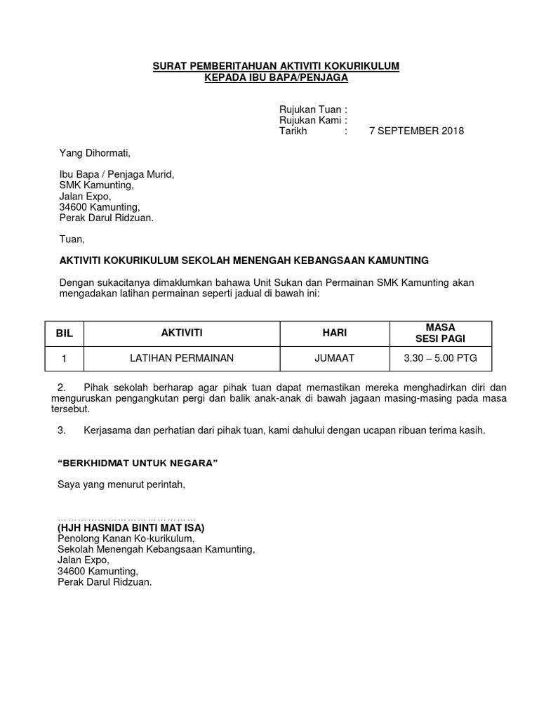 Surat Pemberitahuan Aktiviti Kokurikulum Di Sekolah