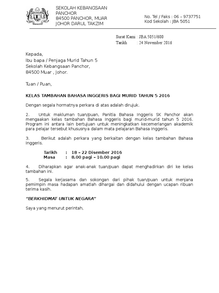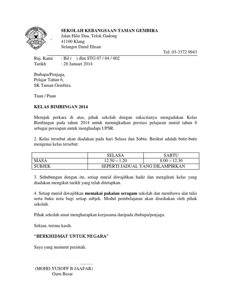 Surat makluman kelas tambahan. 2 30 petang 05 00 petang kehadiran. Ibu bapa penjaga. Jika terdapat sebarang kemusykilan tentang jadual tersebut boleh berhubung terus kepada pihak pengurusan sekolah.