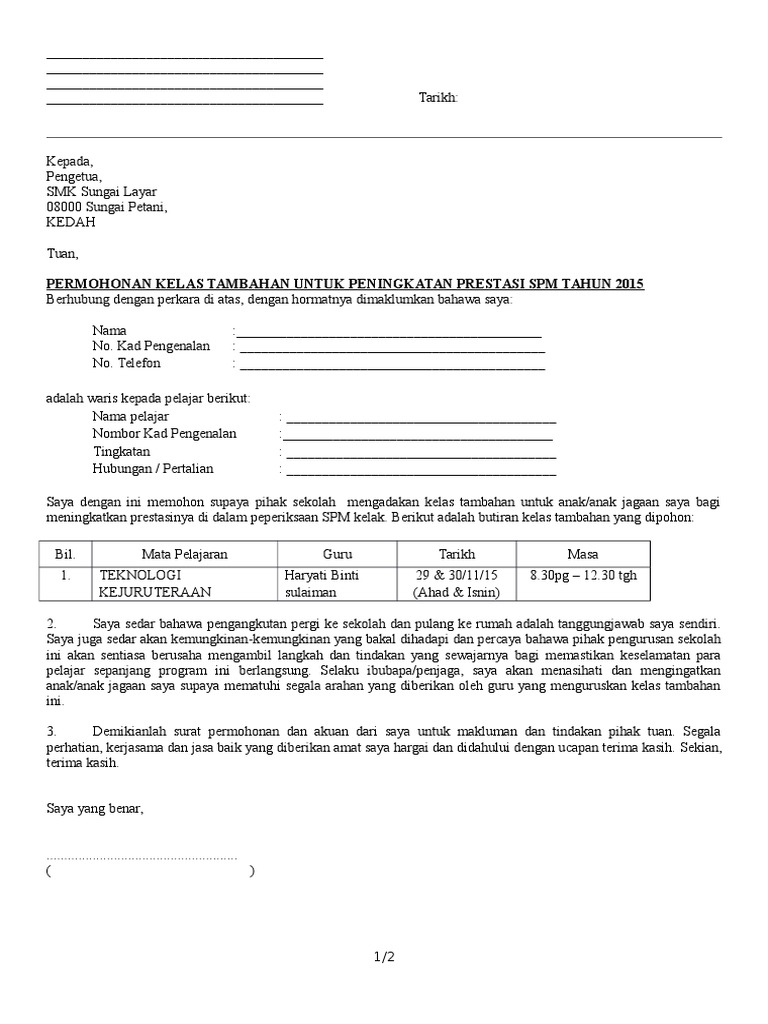 Surat Rasmi Permohonan Kelas Tambahan Surat Rasmi H
