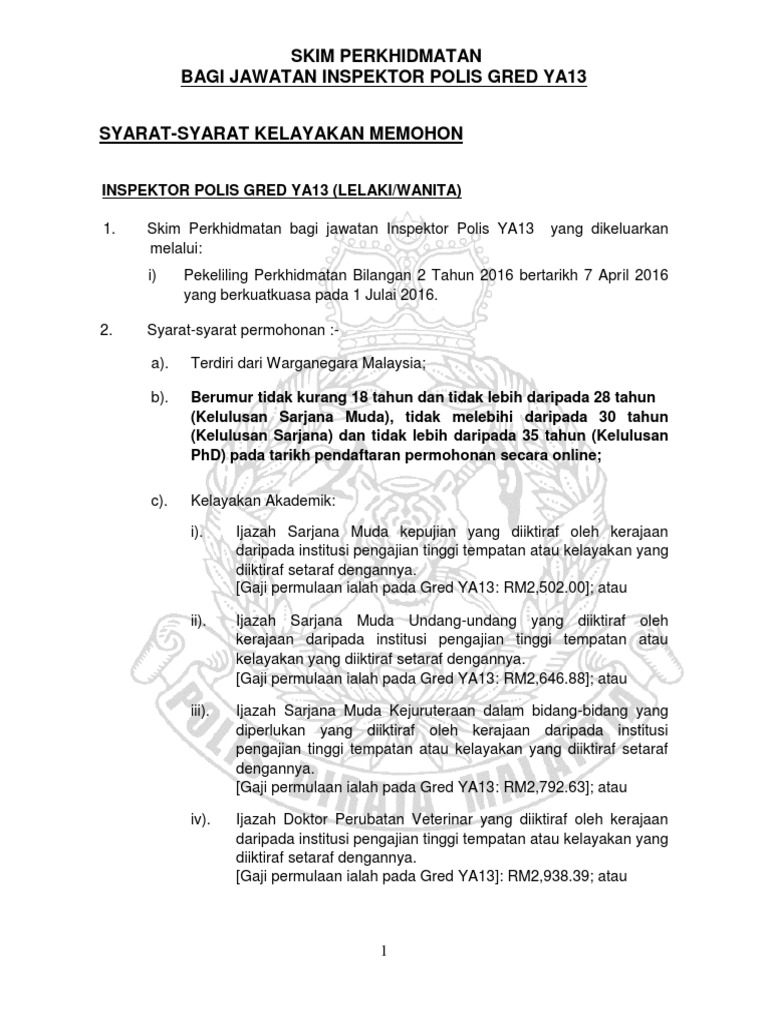 Skim Perkhidmatan Bagi Jawatan Inspektor Polis Gred Ya13