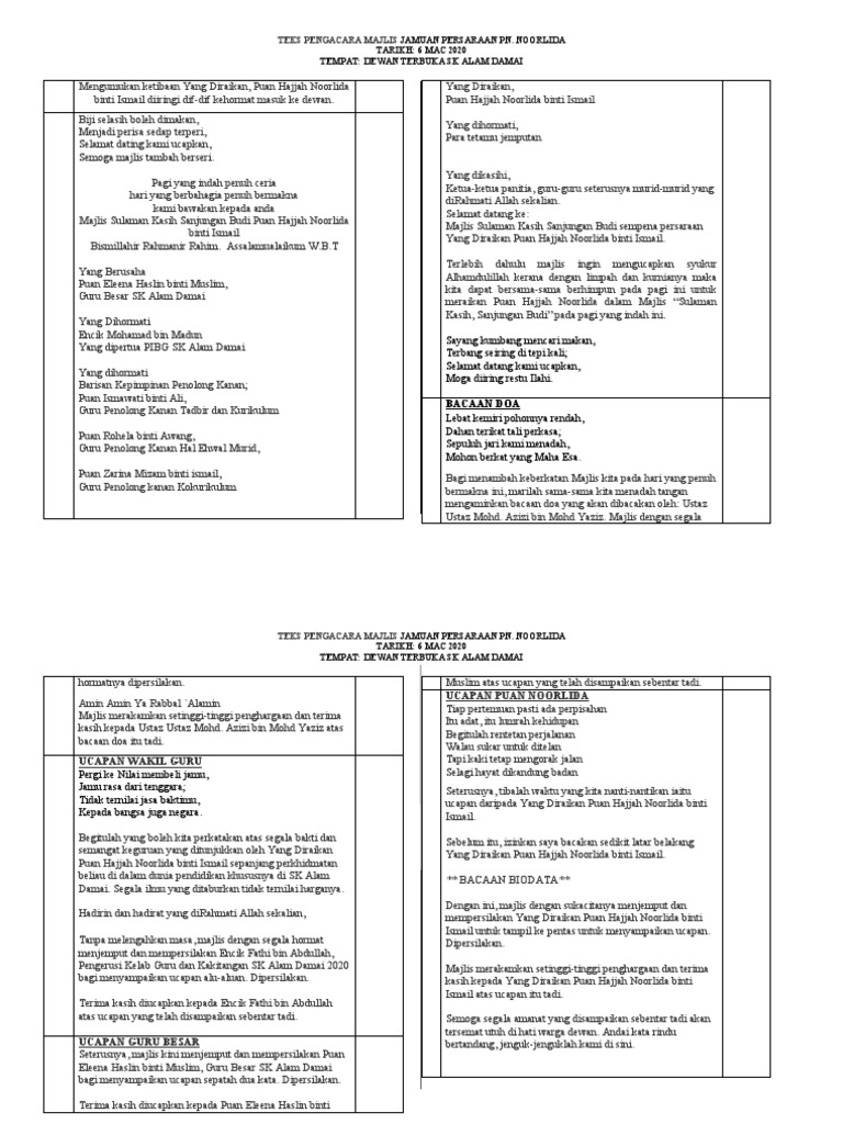 Teks Pengacara Majlis Jamuan Persaraan Pn Noorlida Tarikh 6 Mac 2020 Tempat Dewan Terbuka Sk Alam Damai