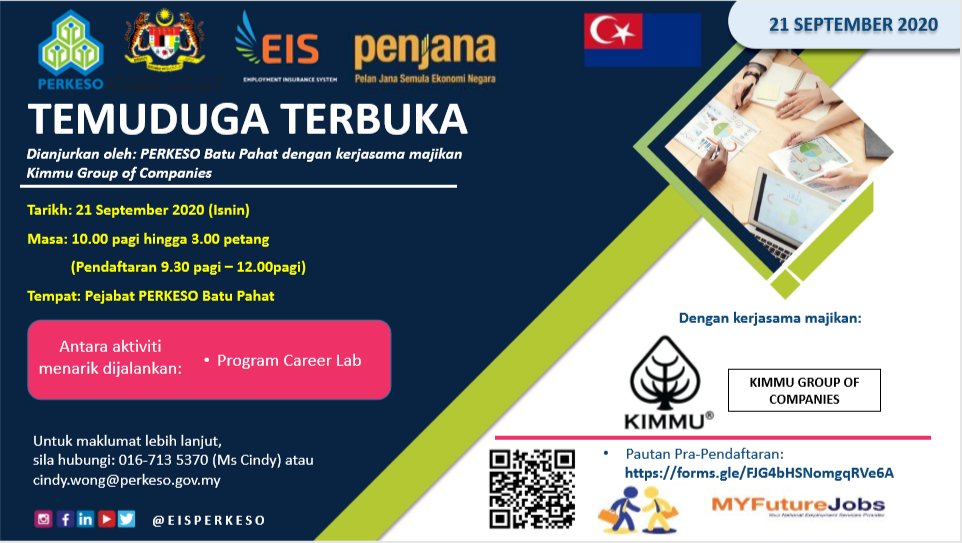 Employment Insurance System On Twitter Temuduga Terbuka Mingguan Di Batu Pahat Johor Tarikh 21 September 2020 Isnin Masa 10 00 Pagi 3 00 Petang Pendaftaran 9 30 Pagi Hingga 12 00 Tengah Hari Tempat Pejabat