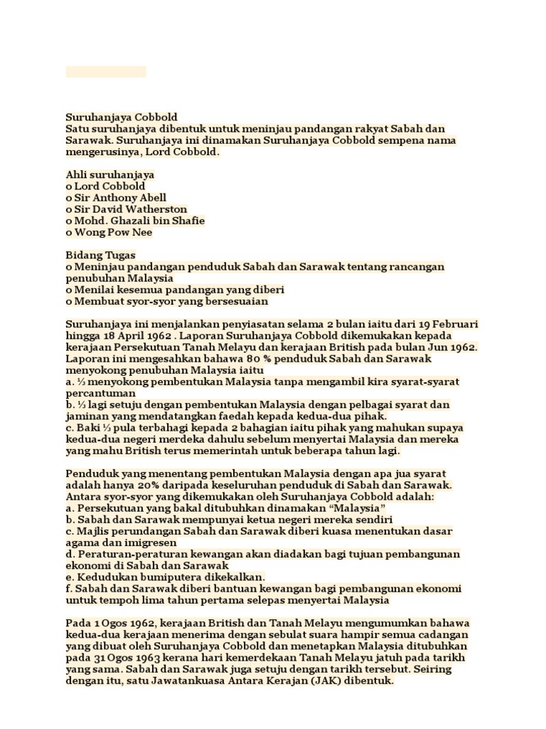 Lawas Kami Latarbelakang Penubuhan Malaysia 1963 Suruhanjaya Cobbold Suruhanjaya Cobbold Dibentuk Pada 17 Januari 1962 Hasil Dari Perundingan Antara Kerajaan Persekutuan Tanah Melayu Dan Kerajaan British Pada November 1961 Tujuan
