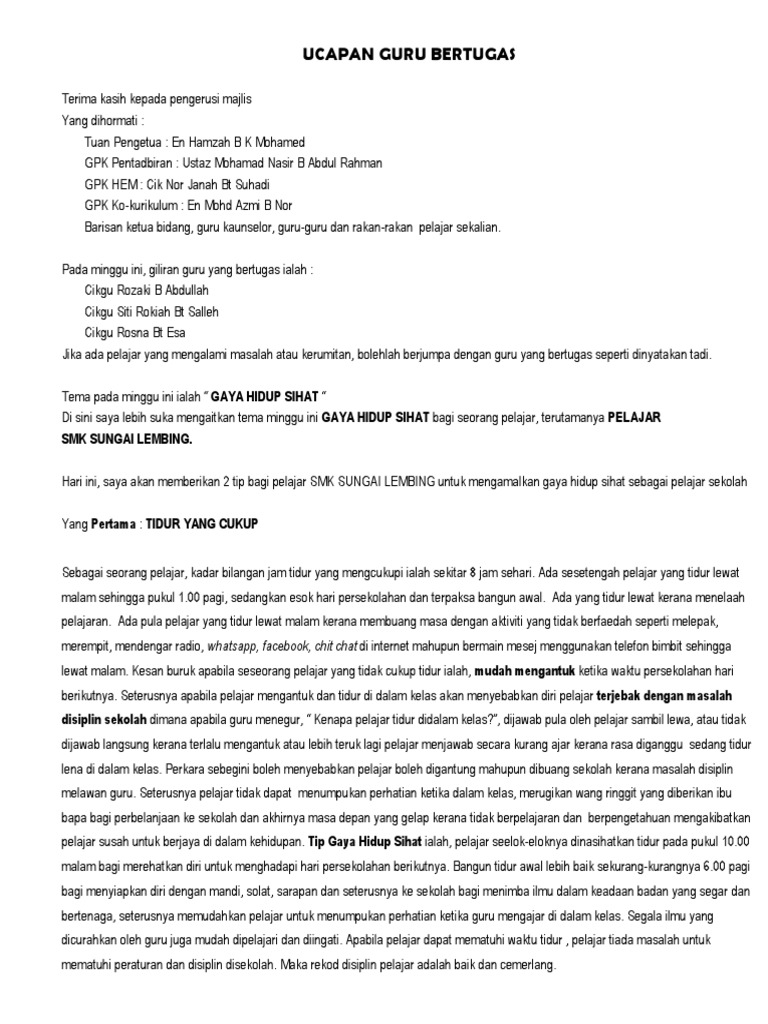 Teks Ucapan Guru Bertugas Mingguan