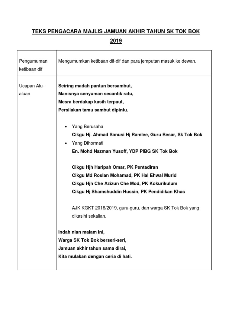 Hadirin yang dimuliakan tak molek jika ada alu tiada lesungnya. Aktif sebagai perunding dalam bidang pembangunan kepimpinan karismatik peringkat sekolah dan universiti. Majlis merakamkan ucapan terima kasih kepada semua yang terlibat menjayakan majlis kita pada hari ini. Contoh teks ucapan pengacara majlis sempena jamuan akhir tahun.