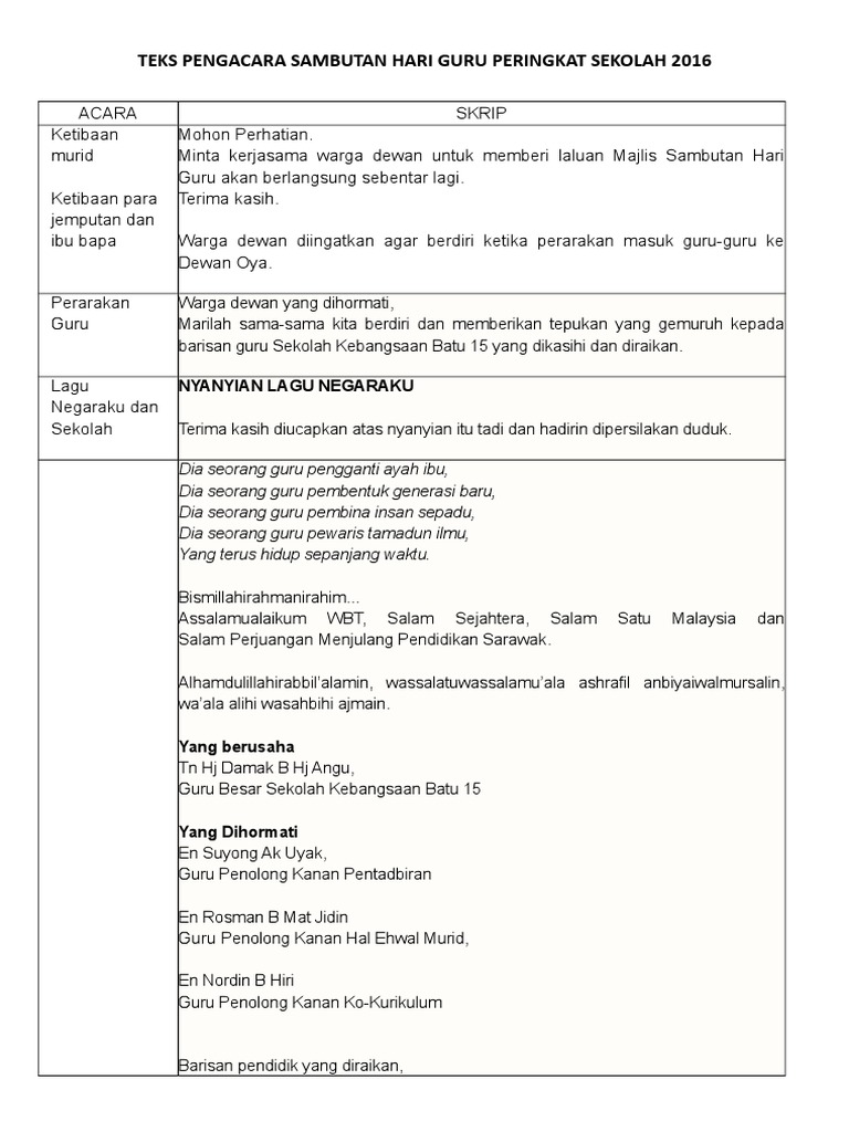 Oleh itu saya telah menambah beberapa perkara dalam teks ucapan tersebut untuk disesuaikan dengan tema hari guru pada tahun ini. Hari ini kami. Di kesempatan ini saya ingin mengucapkan setinggi tinggi ucapan terima kasih kepada semua yang hadir. Yang dihormati pk kurikulum puan hasmah bt ismail pk hal ehwal murid puan zaiton bt ramli.