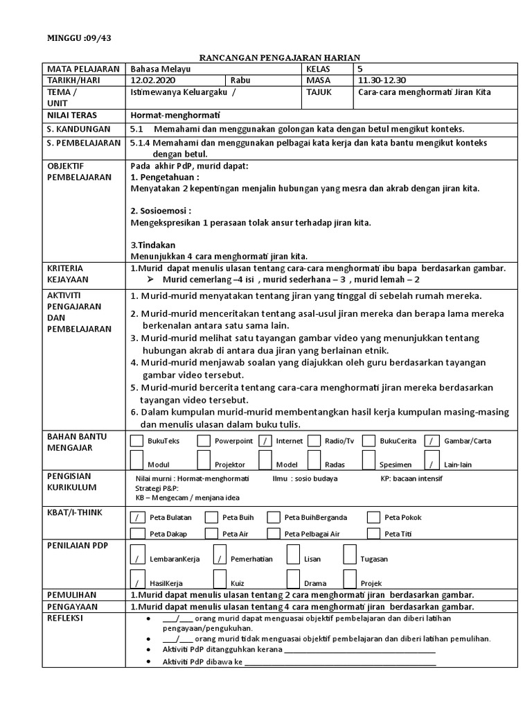 Nilai Teras Hormat Menghormati Minggu 09 43 Rancangan Pengajaran Harian