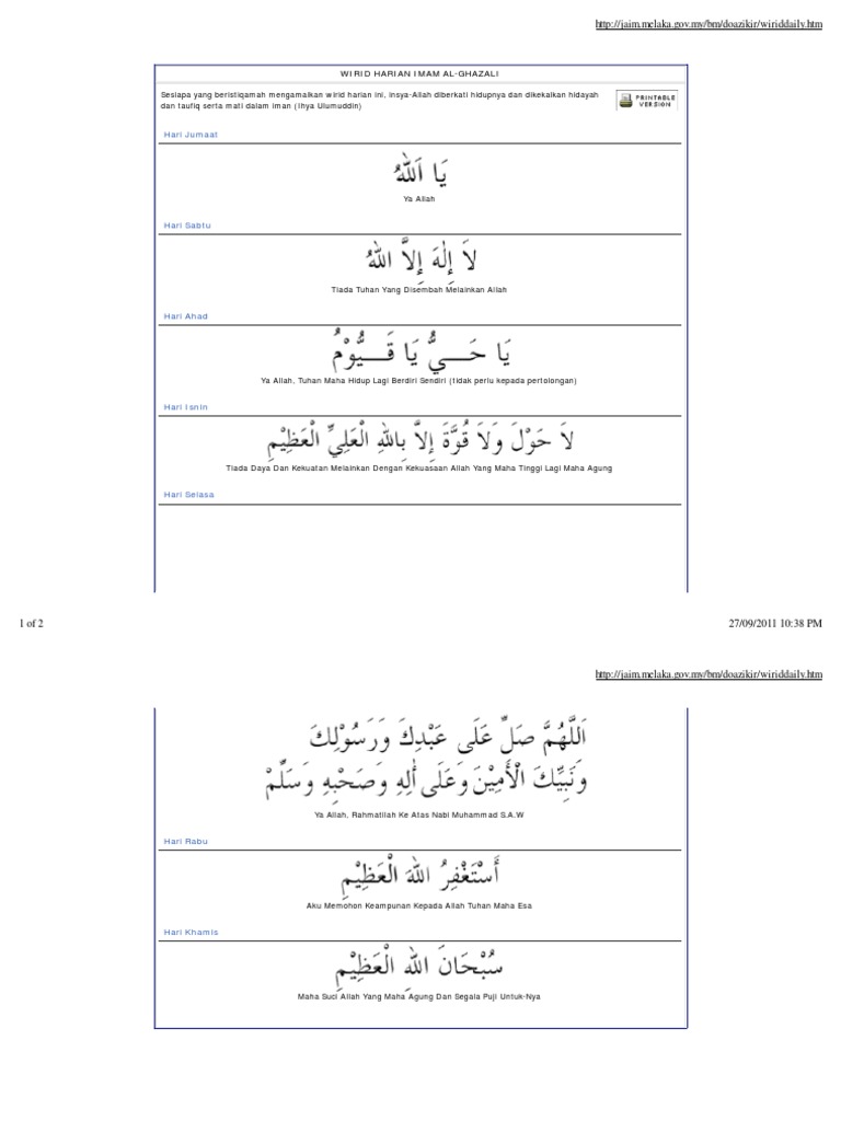 Wirid 10 imam ghazali. Namun begitu anda tidak perlu terikat dengan bilangan ini. Ya hayyu yaa qayyum 1000x pada hari senin membaca hauqalah. Berikut adalah zikir harian sepertimana yang diamalkan oleh imam al ghazali. Misalkan hari jum at dihitung sedari waktu shalat asar pada hari kamis hingga waktu ashar hari jum at.